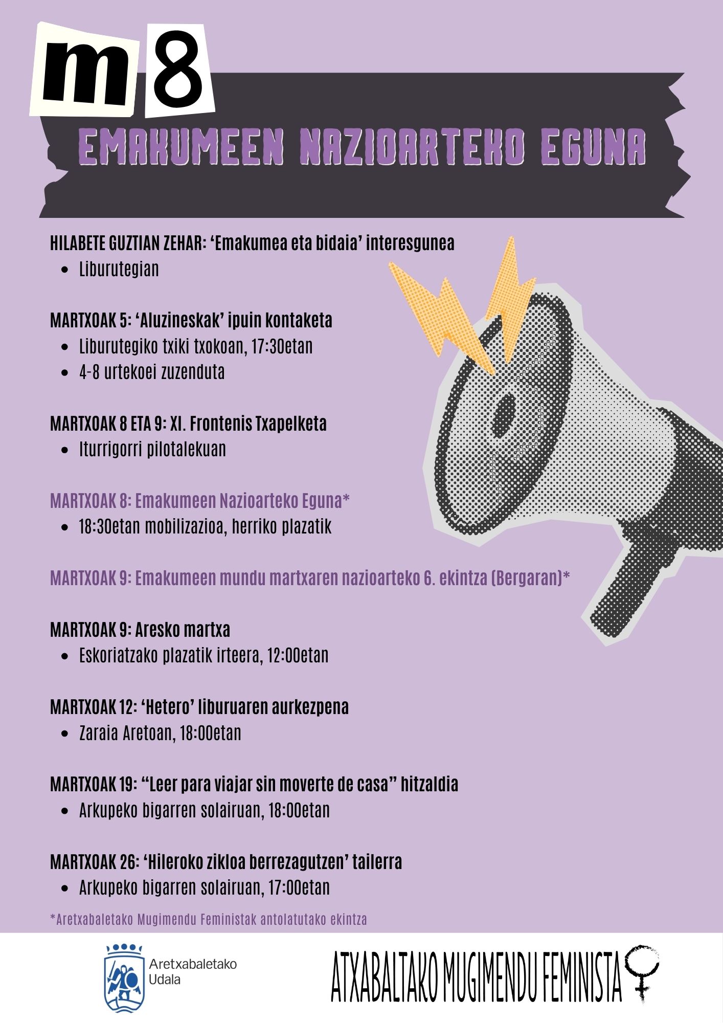 El Día Internacional de las Mujeres es un día de acción, por lo que desde el Ayuntamiento invitamos a toda la ciudadanía a participar en el programa organizado en colaboración con otros agentes del municipio. Además, sumándonos a la convocatoria realizada por el Movimiento Feminista de Aretxabaleta, hacemos un llamamiento a la ciudadanía a participar en la mobilización que se celebrará el 8 de marzo a las 18:30.