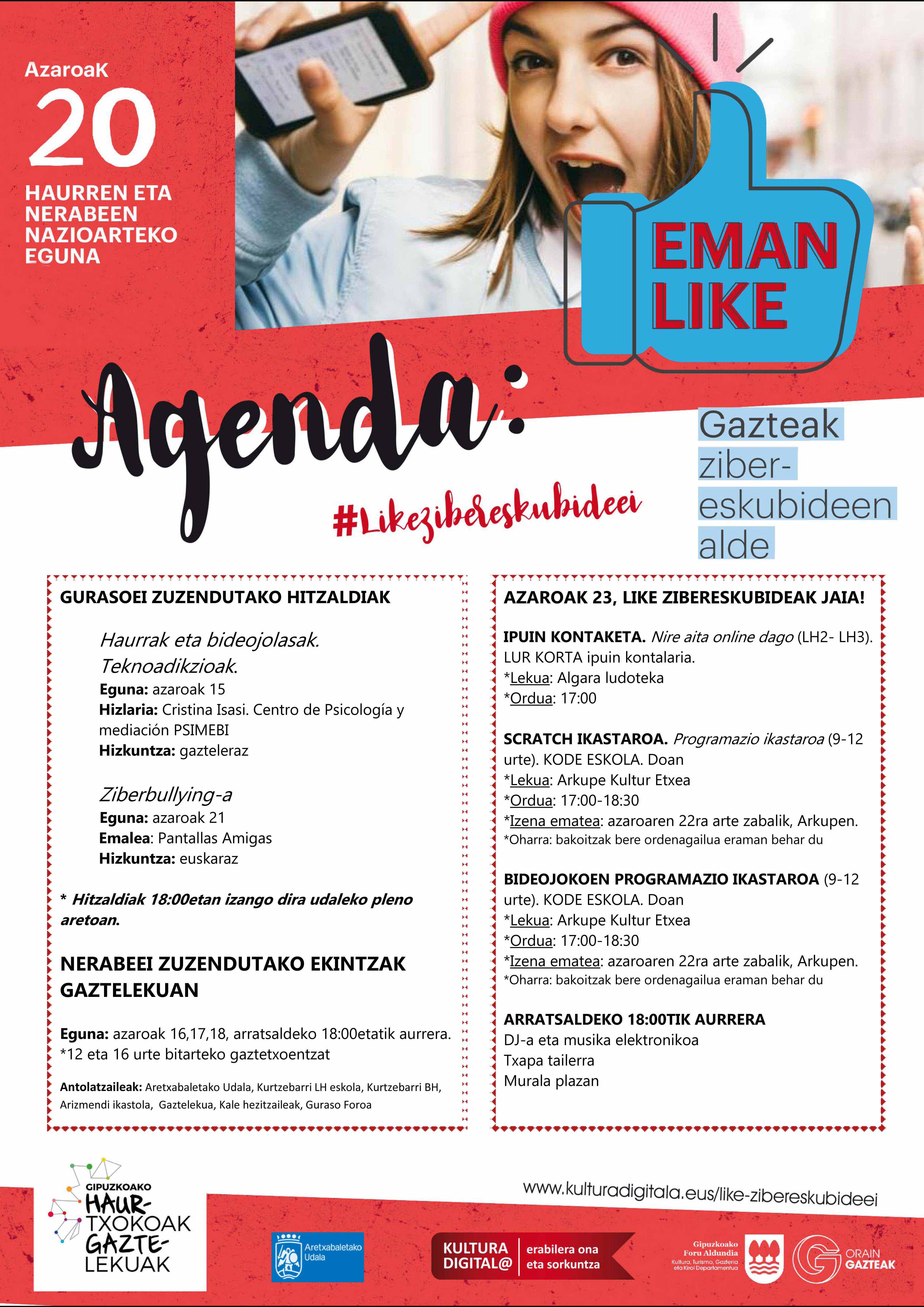 El próximo 20 de noviembre es el Día Internacional de los derechos la Infancia y la Adolescencia y con ese motivo, la Diputación Foral de Gipuzkoa pondrá en marcha la campaña “Like a los ciberderechos”, para sensibilizar a la infancia y la adolescencia sobre los derechos y obligaciones del mundo digital.