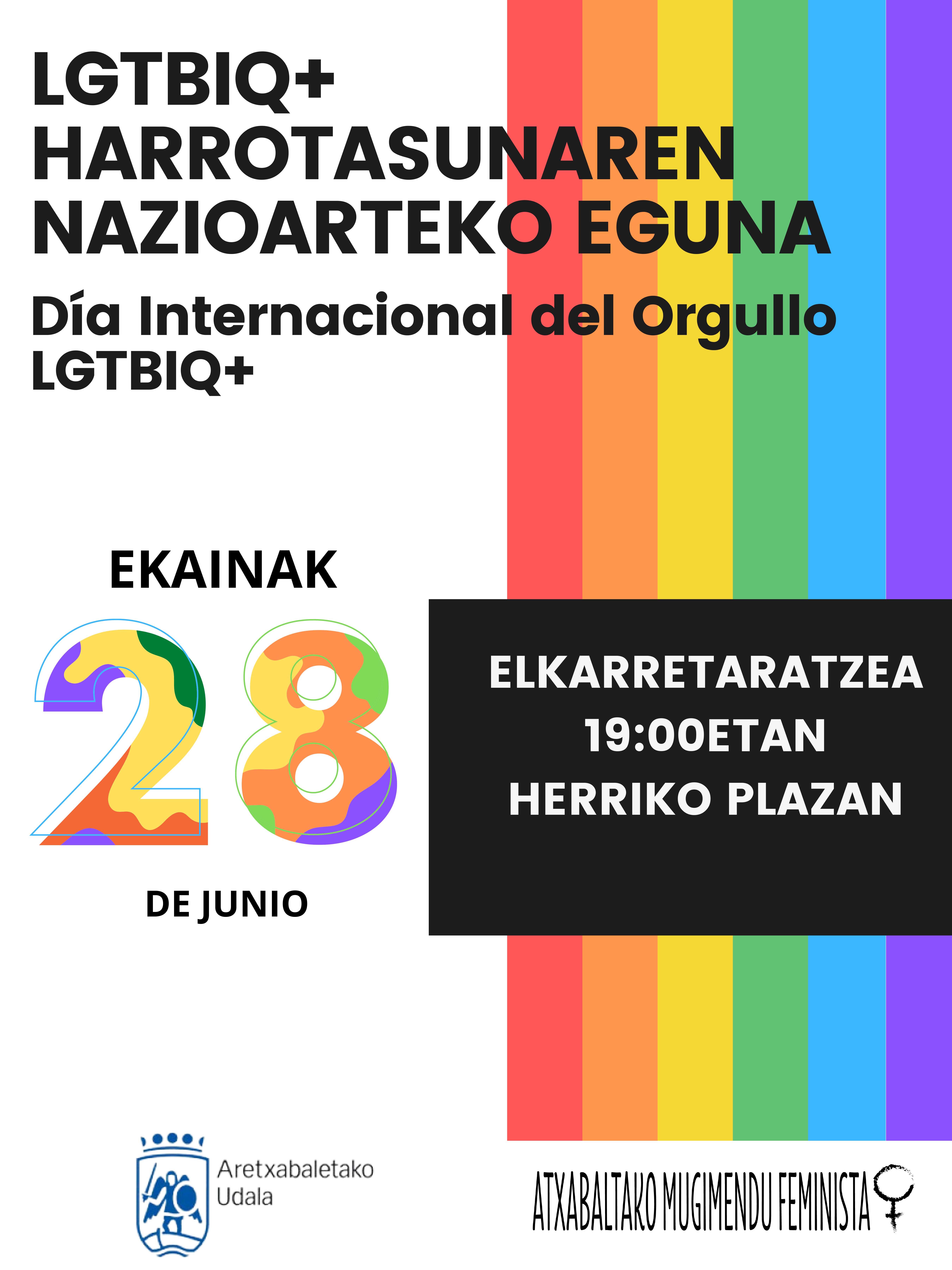 Hoy se celebra el Día Internacional del Orgullo LGTBIQ+. El Ayuntamiento y Atxabaltako Mugimendu Feminista llaman a participar en la concentración que se llevará a cabo esta tarde en la Herriko plaza, a partir de las 19.00 horas.