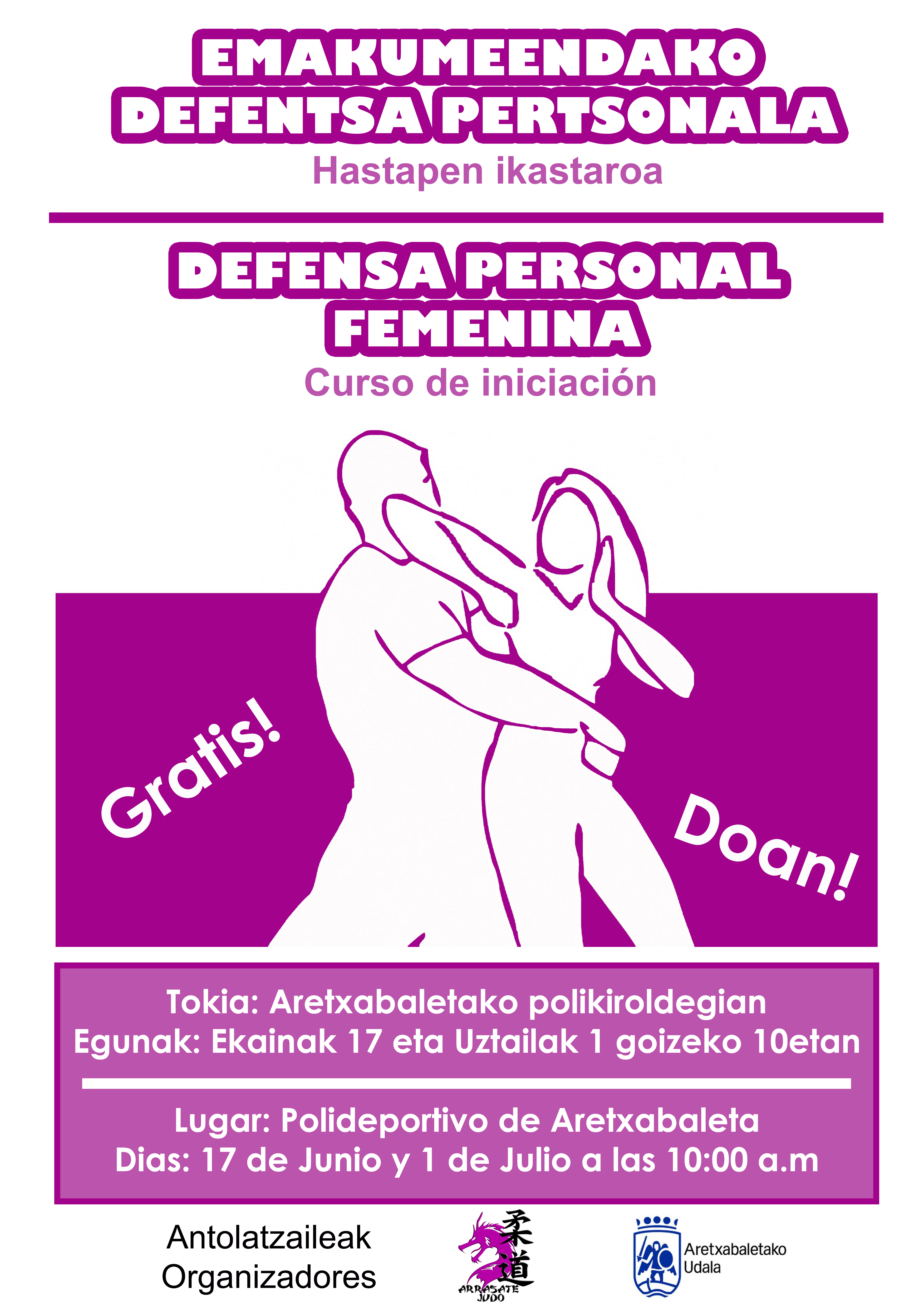 El ayuntamiento, junto con el club de judo Arrasate ha organizado un curso de defensa personal para mujeres. Las clases se llevarán a cabo en el polideportivo Ibarra los días 17 de junio y 1 de julio, a las 10:00 de la mañana. Para inscribirse llamar al polideportivo (943 03 98 42).