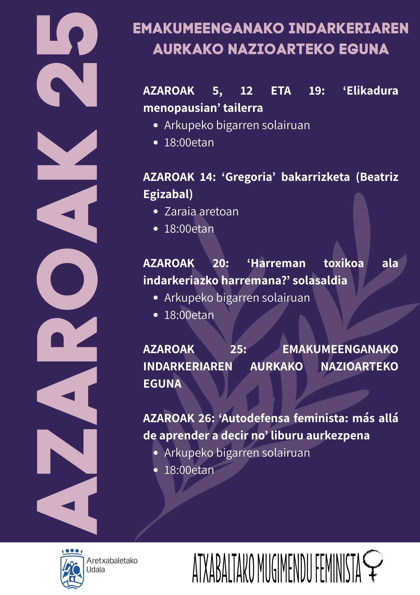 Sin embargo, es responsabilidad de toda la población construir progresivamente una Aretxabaleta más igualitaria, comenzando por las tareas cotidianas e incidiendo en nuestro entorno más cercano. Por lo tanto, os animamos a participar en las actividades organizadas con motivo del Día Internacional para la Eliminación de la Violencia contra las Mujeres (charlas, actividades culturales, movilizaciones...).