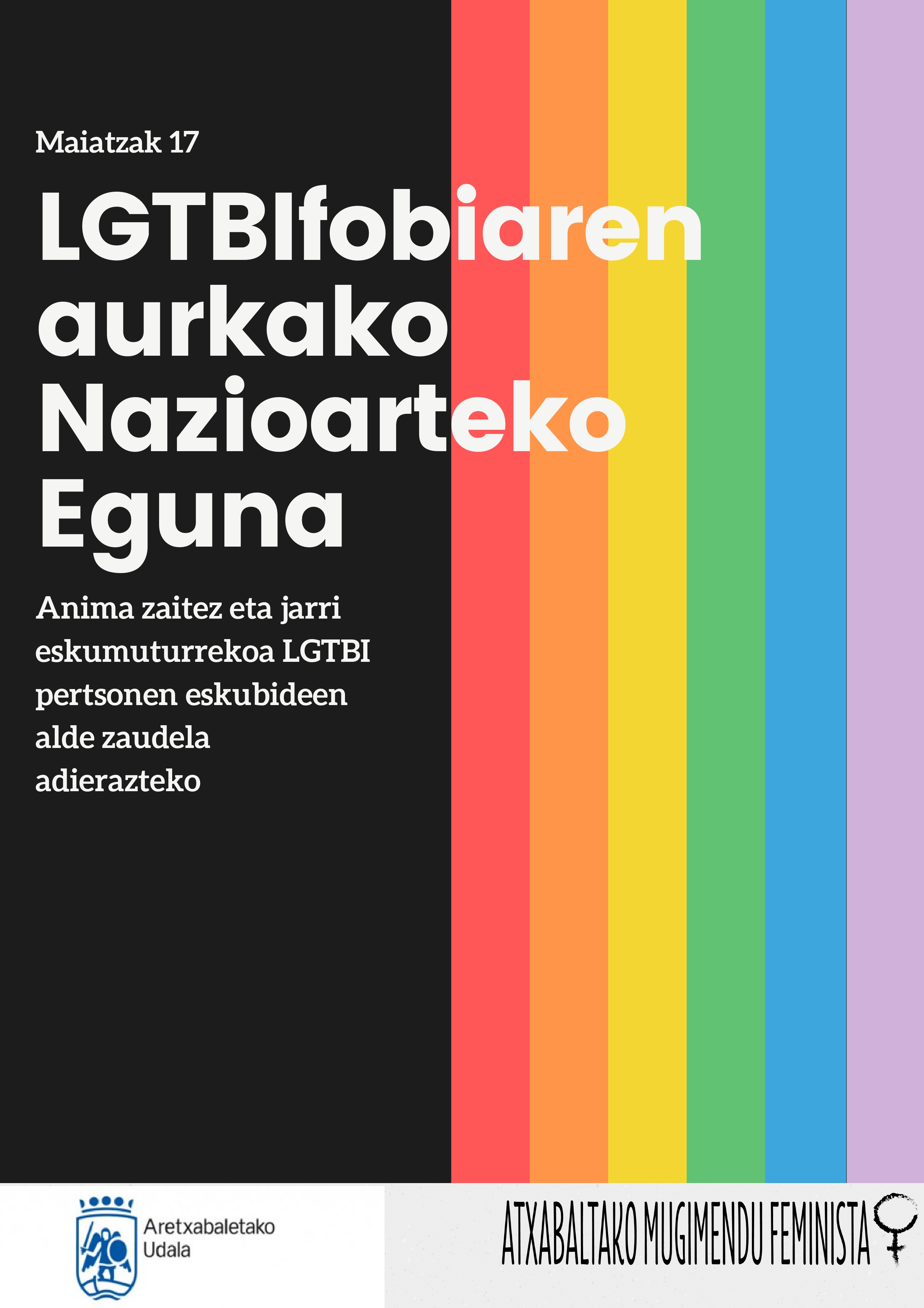 El Ayuntamiento de Aretxabaleta se suma a las reivindicaciones del día Internacional contra la LGTBIfobia, y se compromete a seguir trabajando en la construcción de una sociedad más respetuosa e igualitaria. Asímismo, hacemos un llamamiento a la ciudadanía de Aretxabaleta para que participe en las concentraciones que tendrán lugar en la comarca.