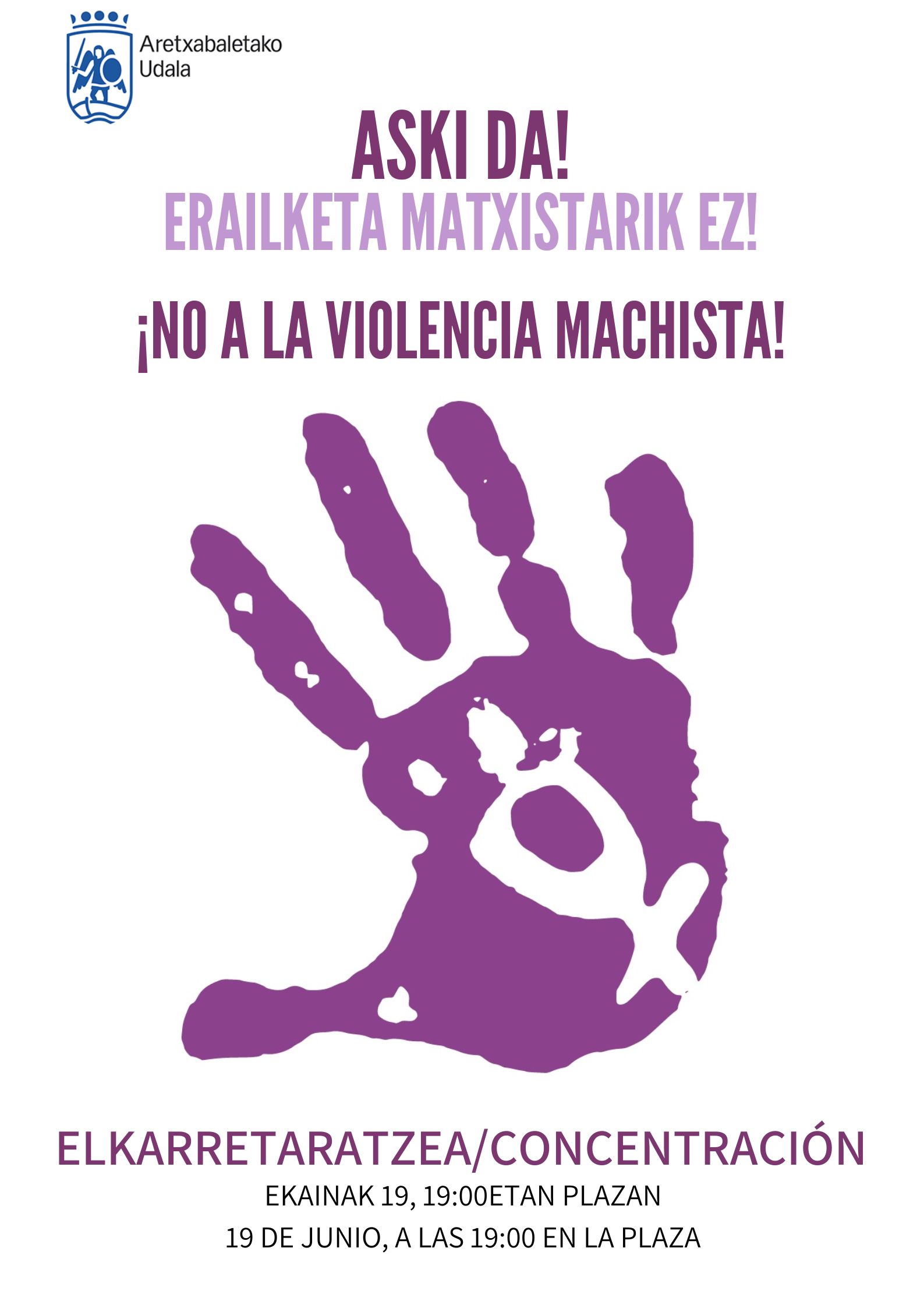 El Ayuntamiento de Aretxabaleta condena el asesinato machista de una mujer de 89 años en Bilbo este 15 de junio y muestra su apoyo y cercanía a sus familiares y allegados.