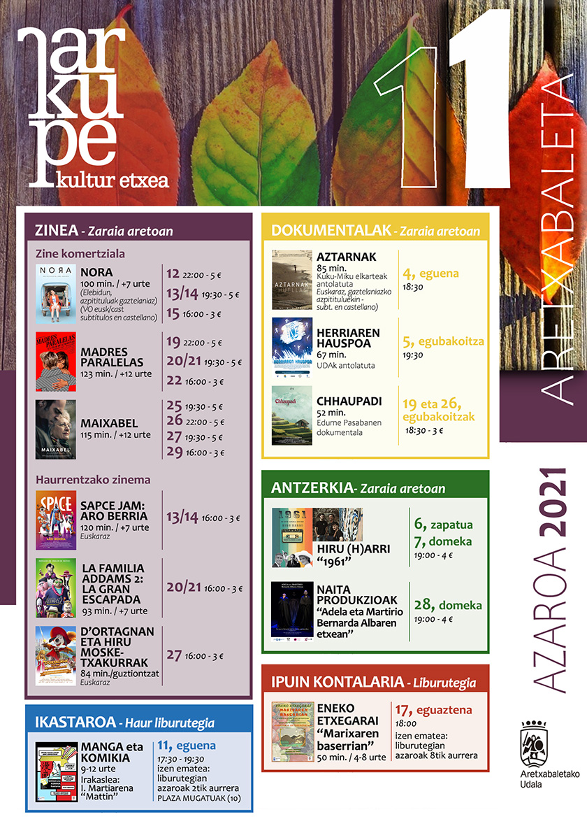 En cuanto a los documentales, el día 4 de noviembre, y con la organización de Kuku-Miku Elkartea, se proyectará Aztarnak, y el día 5, Herriaren Hauspoa, la cinta que conmemora el 75º aniversario de la UDA. Además, los días 19 y 26 Arkupe acogerá el documental Chhaupadi de la alpinista tolosarra Edurne Pasaban; un trabajo que pone voz a las mujeres de Nepal.