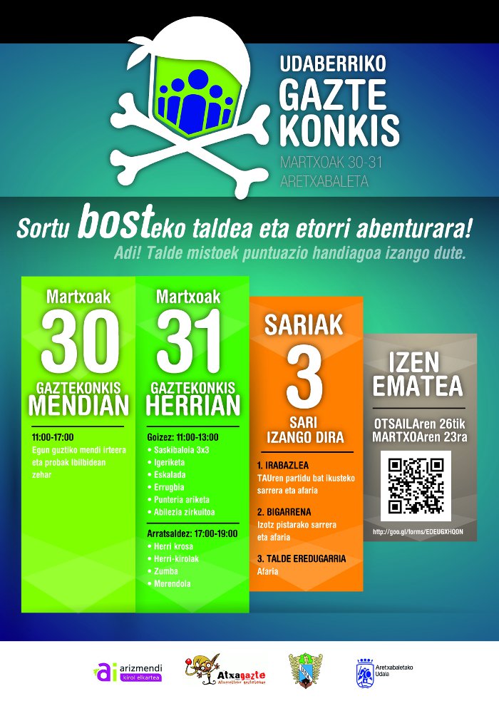 Para participar en Gaztekonkis hay que apuntarse en equipo. Los equipos serán formados por 5 personas. Habrá puntuación extra para los equipos mixtos.