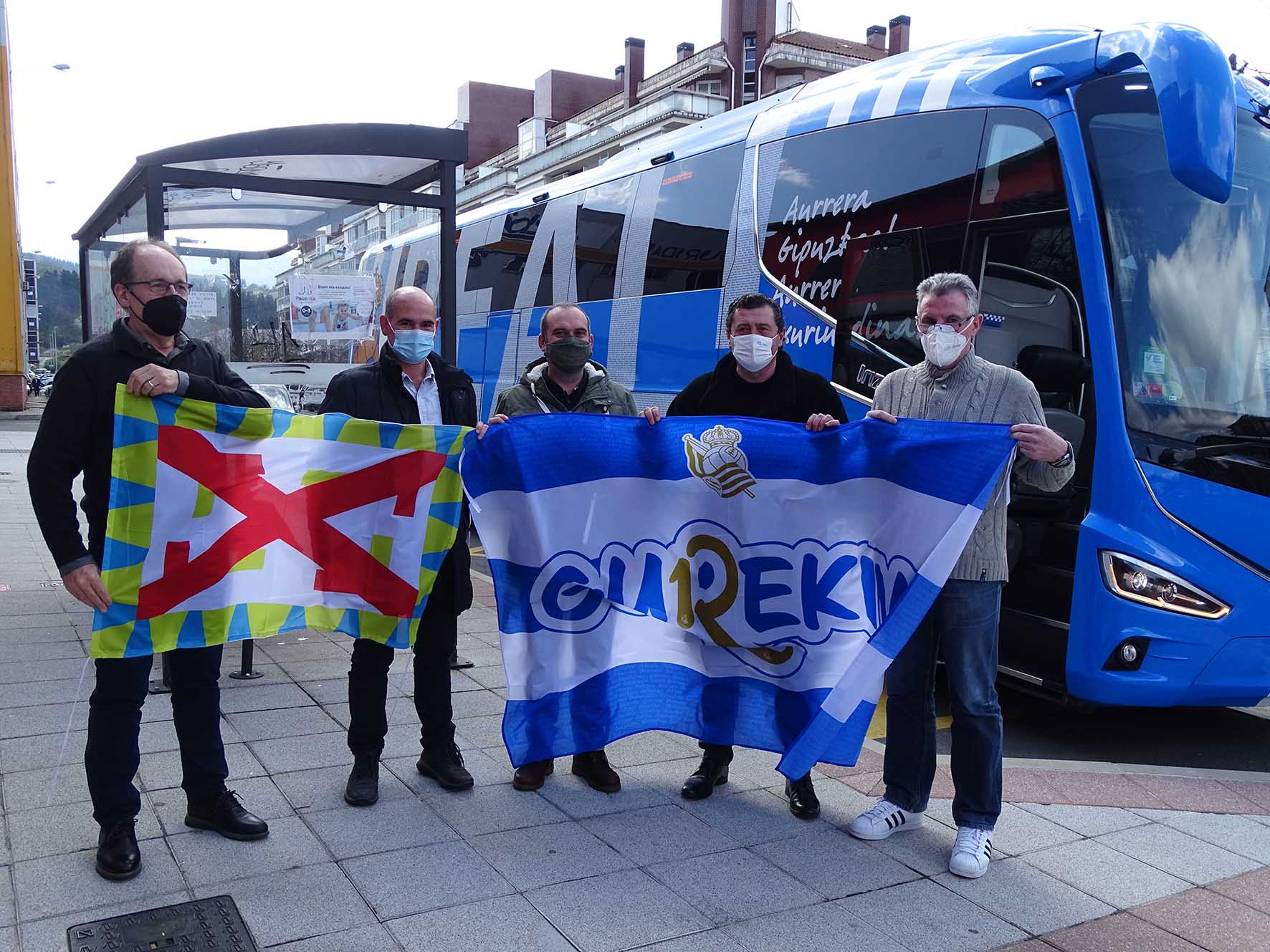 El autobús del club txuri-urdin recaló ayer en el municipio para recoger la enseña atxabaltarra de manos del alcalde, Unai Elkoro, y el concejal de Deportes, Koldo Zubillaga. A cambio, representantes de la Real entregaron la bandera txuri-urdin que se colgará en la balconada consistorial.