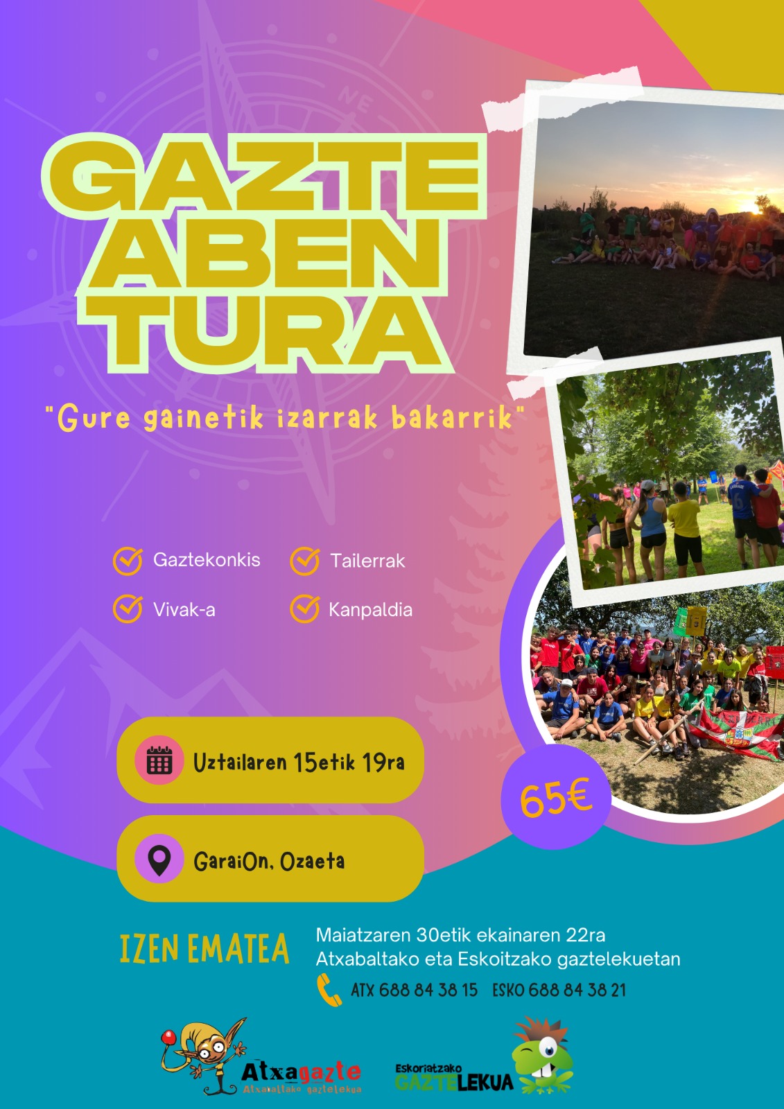 Gazteabentura son udalekus de 4 noches y 5 días para adolescentes de Eskoriatza y Aretxabaleta. Durante los tres primeros días se realizará una competición entre grupos en formato Gaztekonkis y en los dos días siguientes, se realizarán diferentes actividades: actividades acuáticas en el pantano Garaio, dormir mirando las estrellas en el castillo de Gebara, juegos, veladas… ¡y mucho más!