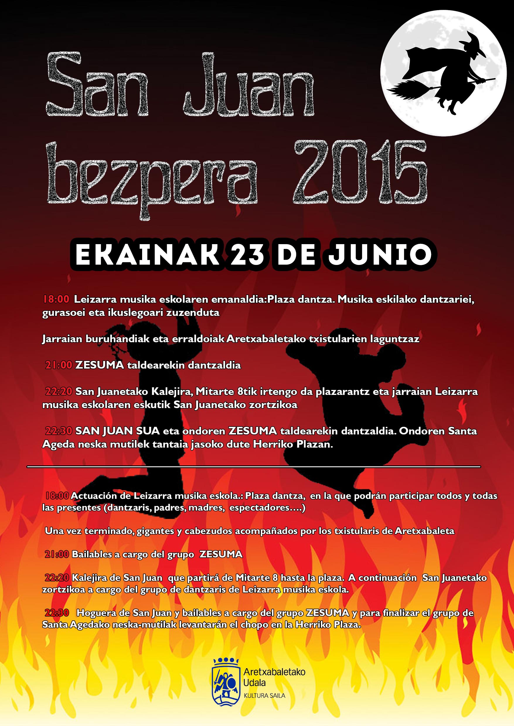 22:30 Hoguera de San Juan y bailables a cargo del grupo ZESUMA y para finalizar el grupo de Santa Agedako neska-mutilak levantarán el chopo en la Herriko Plaza.