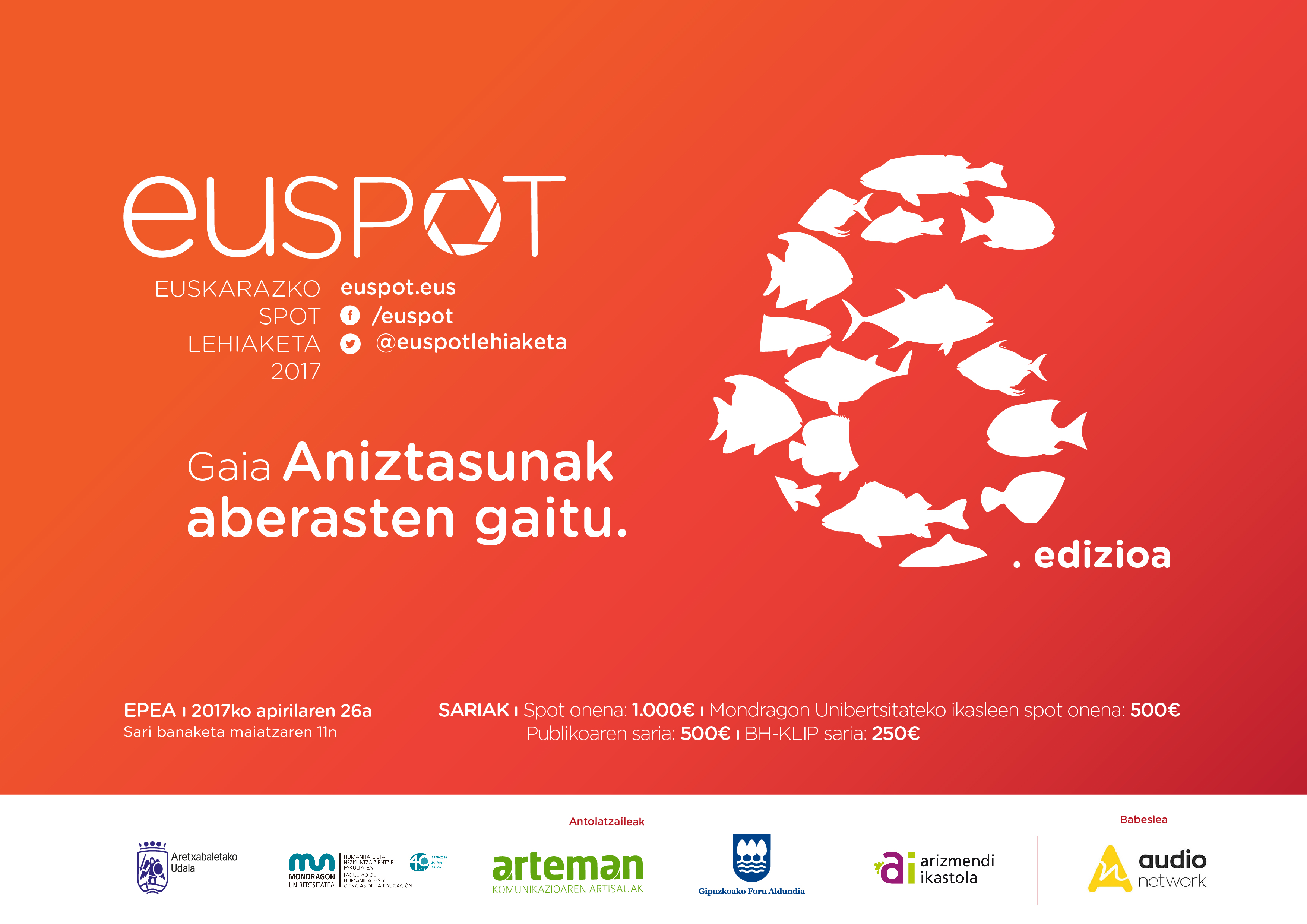 Ya está en marcha la sexta edición del concurso que se ha convertido en referente en Euskadi de spots en el que confluyen la publicidad, la creatividad y el euskera. El concurso de spots de la presente edición ha echado a andar bajo el lema ha “La diversidad nos enriquece” y en el acto de presentación del mismo, han estado presentes tanto los promotores de la iniciativa como los representantes de la organización del mismo: Mikel Irizar, Director de Euskera de la Diputación Foral de Gipuzkoa, Unai Elkoro, alcalde de Aretxabaleta, Goio Arana, representante de Mondragon Unibertsitatea, Edurne Balzategi responsable de comunicación de Arizmendi Ikastola y Arantzazu Lagunilla, directora de Arteman.