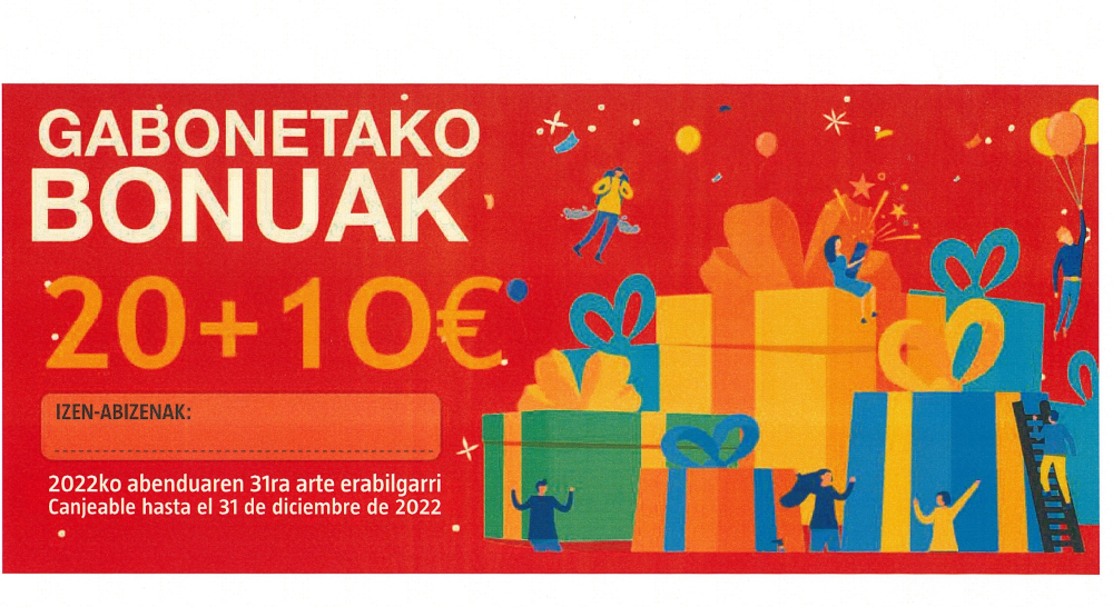 A las puertas de la Navidad, el Ayuntamiento de Aretxabaleta vuelve a poner en marcha una nueva edición de los bonos dirigidos a incentivar las compras en el comercio local. A partir de mañana, 1 de diciembre, se pondrán a la venta 500 vales ‘20+10€’: el comprador o compradora pagará 20 euros y se llevará diez euros gratis para consumir 30 euros en 54 establecimientos asociados a Aretxarte (comercios, bares y servicios).