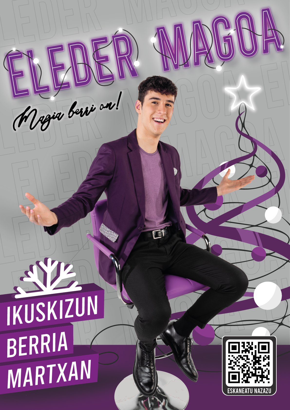 El espectáculo del mago Eleder es un programa de una hora que tiene mucho más que magia. Se trata de un gran espectáculo, participativo y espectacular, dirigido a todas las edades. Además de mezclar magia, juego, danza y canto, el público logrará ser el protagonista del show. El espectáculo del mago Eleder se aleja totalmente de los espectáculos de magia representados hasta ahora en Euskal Herria.
