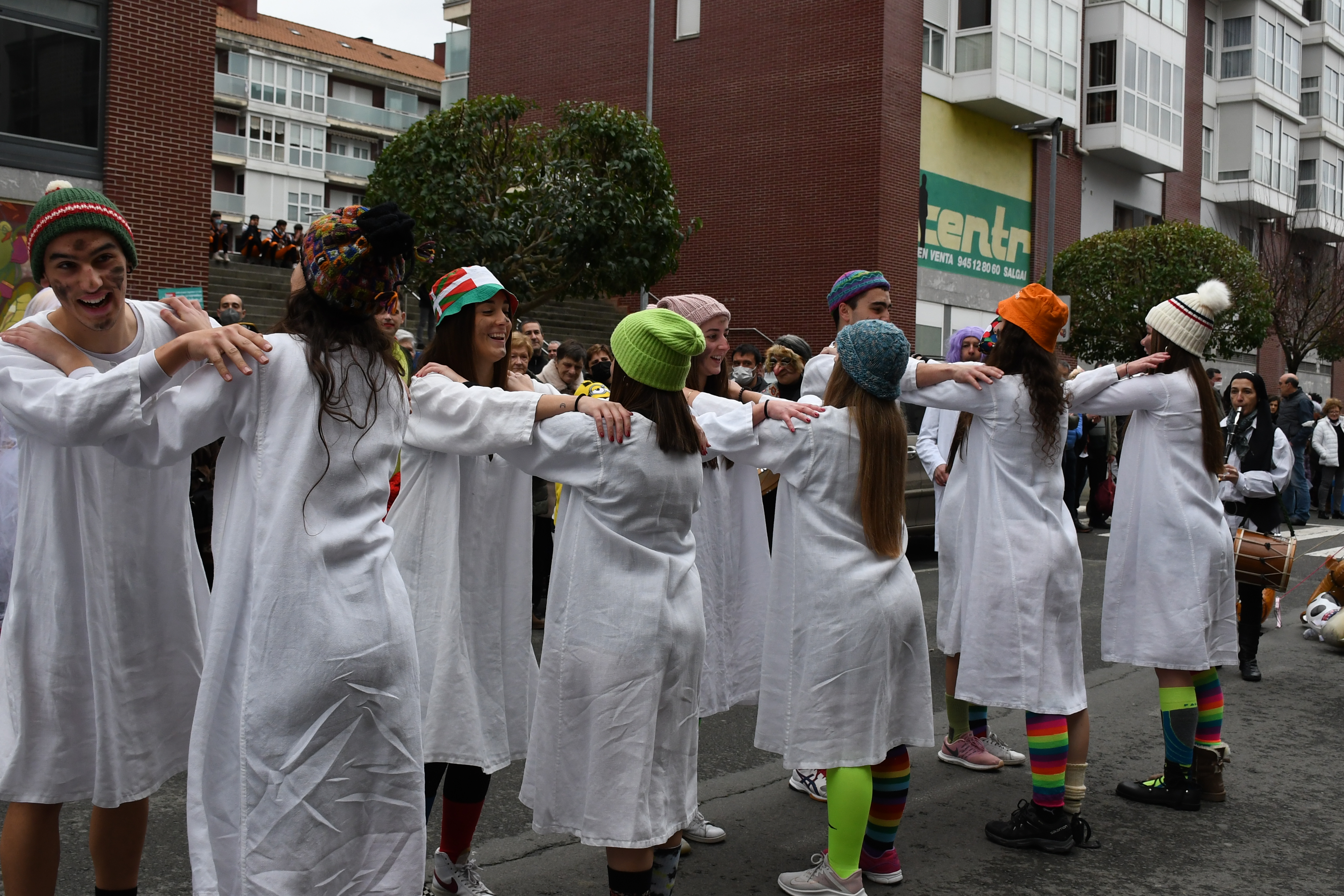 Durante todo el recorrido, los dantzaris van acompañados por toda una banda de txistularis, que son el txistu primero y el segundo, el silbote y el atabal. Este día tocan una diana precisa de los carnavales. Mientras realizan su particular baile, los dantzaris cantan:
