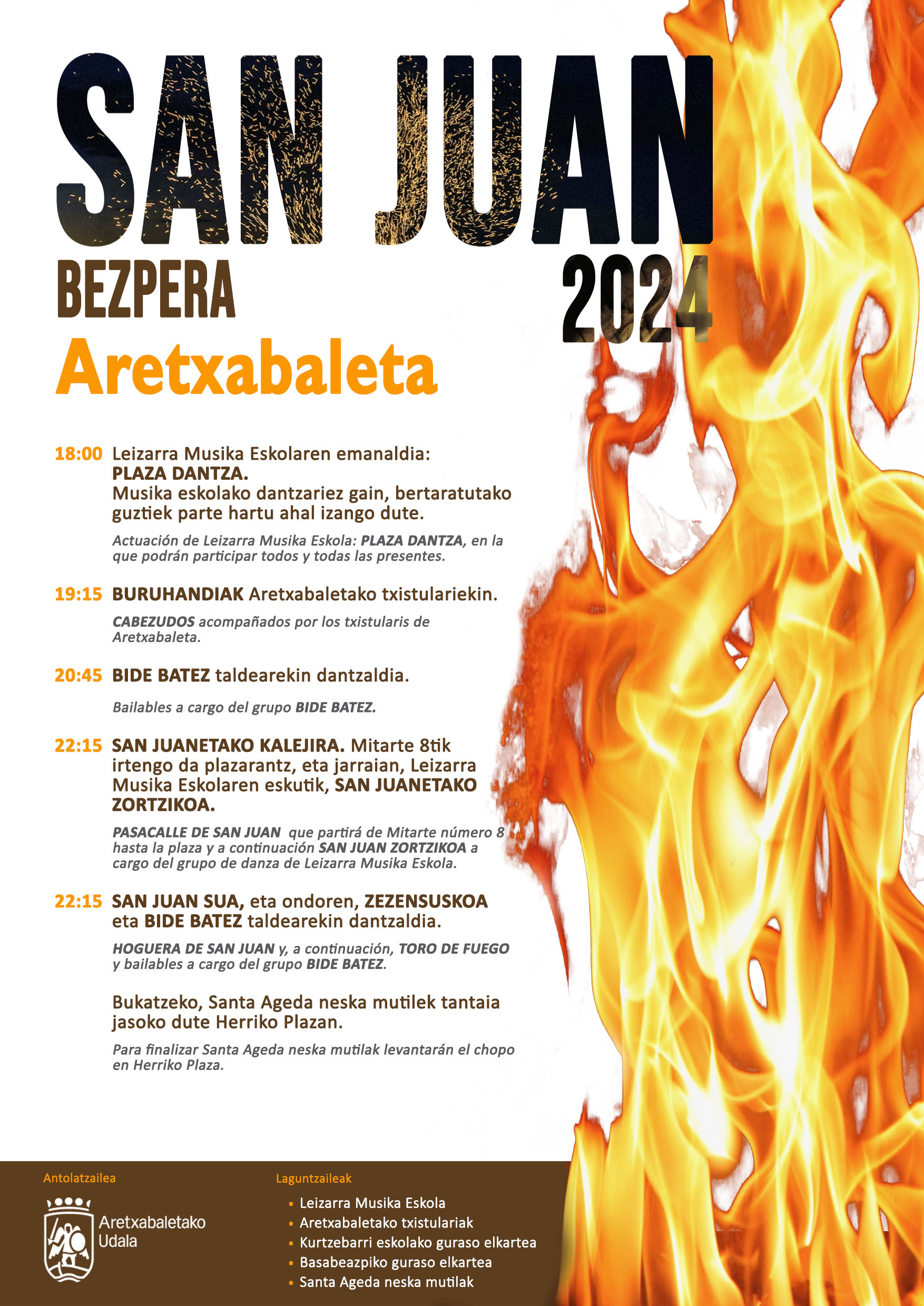 22:15 PASACALLE DE SAN JUAN que partirá de Mitarte número 8 hasta la plaza y a continuación SAN JUAN ZORTZIKOA a cargo del grupo de danza de Leizarra Musika Eskola.