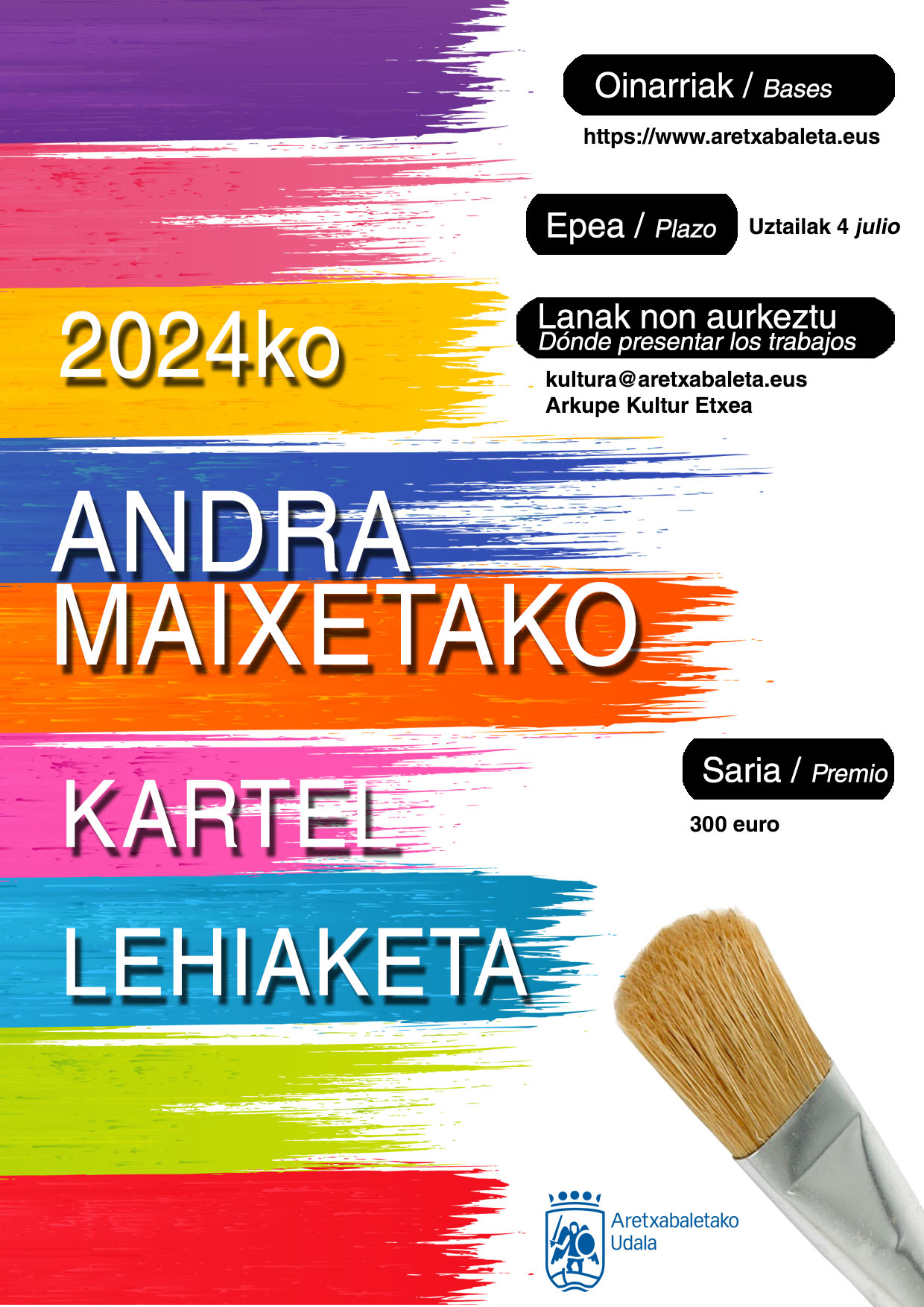 - Posta elektronikoz helbide honetara bidaliz: kultura@aretxabaleta.eus, asuntoan “Andramaixetako kartel lehiaketa 2024” adieraziz.