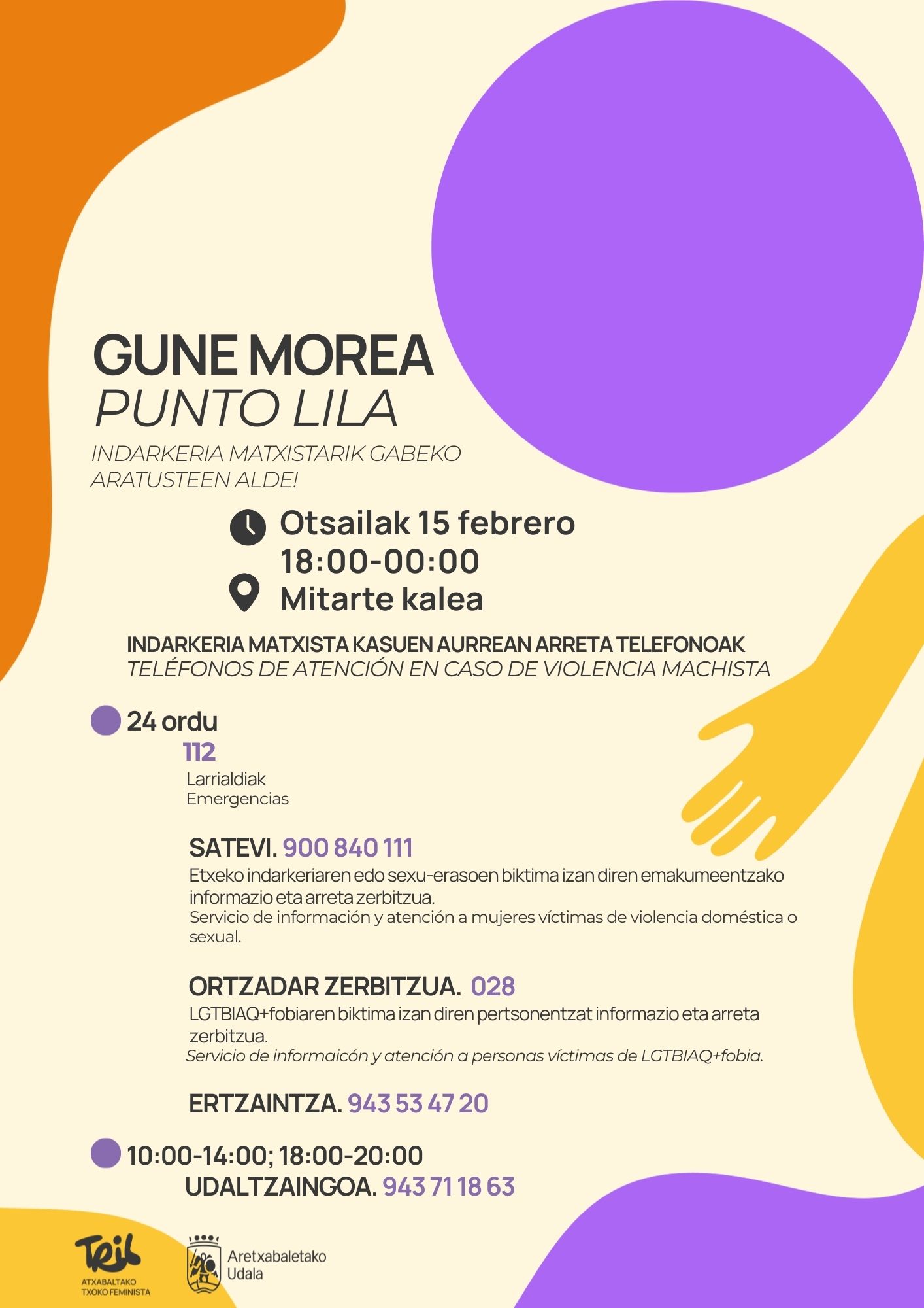 Helburua jai giroan ematen diren eraso matxistak prebenitzea, gertatzen direnei aurre egitea, eta honen kontzientziazioa bultzatzea da. Gune morea, babes leku segurua izango da eskatzen duen edozein pertsonarentzat, eta aldi berean, indarkeria matxistari aurre egiteko bitartekoak eskura jarriko dira: laguntza emozionala, informazioa, aholkua eta biderapena, besteak beste. Era berean, gune honek harreman eta sexualitate osasuntsuak bultzatzea du helburu gisa, prebentzioa bere osotasunean landuz.