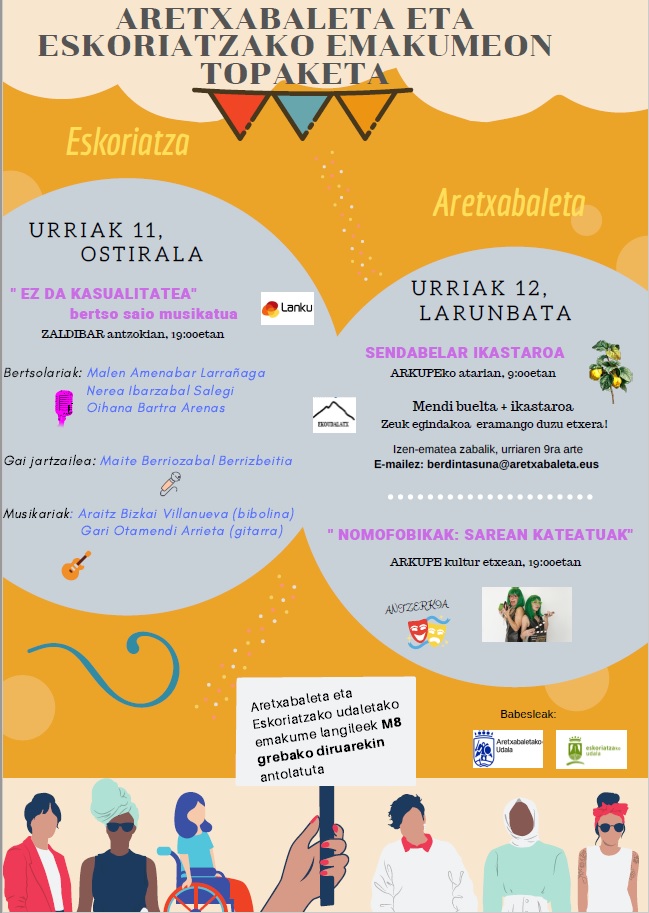Era honetan, hilaren 11 eta 12an Aretxabaleta eta Eskoriatzako Emakumeon topaketa antolatu dute. Lehenengo egunean, Eskoriatzako Zaldibar antzokian elkartuko dira, 19.00etan, Ez da kasualitatea bertso-saio musikatuaz gozatzeko. Urriaren 12an, aldiz, bi ekitaldi izango dira Aretxabaletan. Goizean, inguruko sendabelarrak ezagutzeko aukera egongo da Ekoudalatx-en eskutik. Horretarako, 9.00etan mendi irteera bat egingo dute eta ondoren, tailer bat. Bertan parte hartzeko berdintasuna@aretxabaleta.eus helbidean eman beharko da izena.