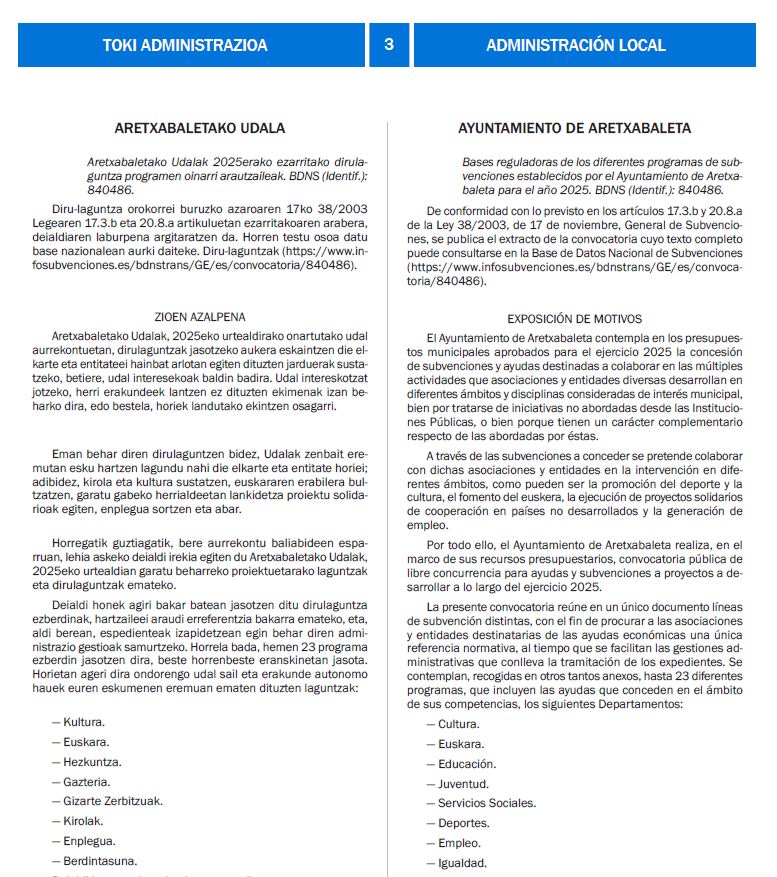 Bertan aurkituko dituzu eskaerak egiteko epea, aurkeztu beharreko dokumentazioa, eskaera egiteko modua eta justifikaziorako agiriak zeintzuk diren jakiteko informazio guztia. Aretxabaletako Diru laguntza deialdia