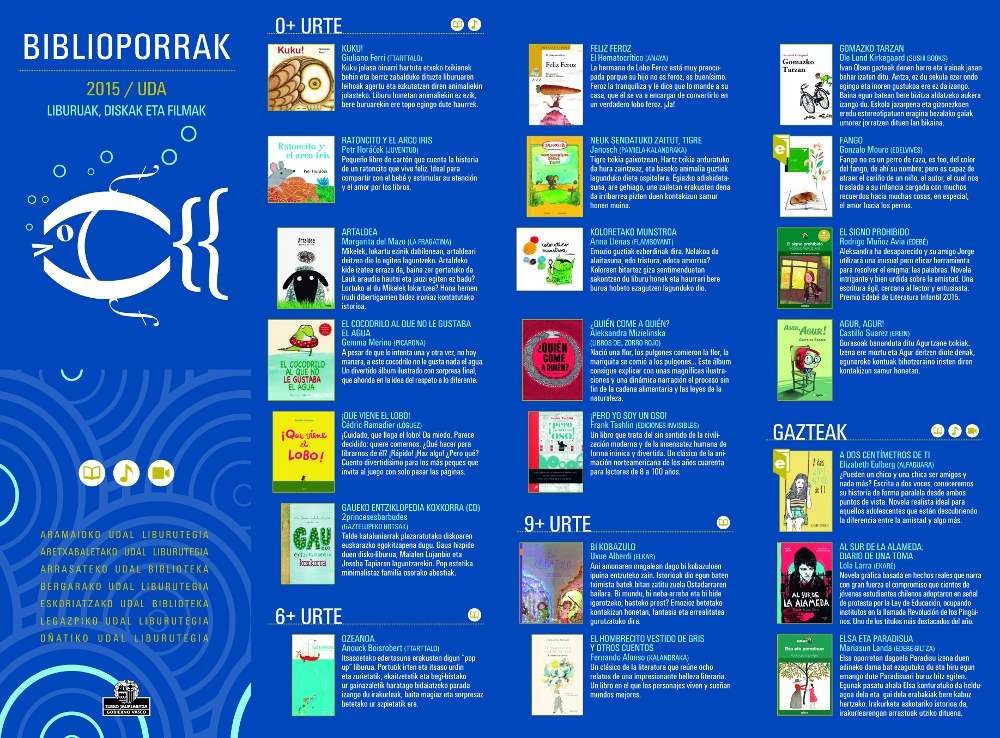 0 urtetik aurrera, 6 urtetik aurrera, 9 urtetik aurrera eta gazteak ataletan seina liburu gomendatzen dira. Helduentzat hamabost liburu, bost diska eta bost film gomendatzen dira.