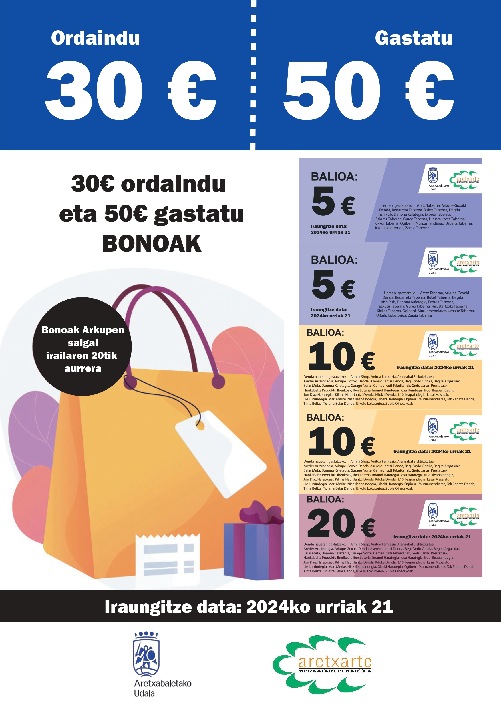 50 euroak honela banatuko dira: kolore urdineko 5 euroko bi bonu, hori koloreko 10 euroko beste bi, eta larrosa koloreko 20 euroko bat. Bost eurokoak tabernetan, Arkupe goxoki dendan, Danonan, Ogiberrin, edo Urkulu lokutorioan gastatu beharko dira. Bonuen iraungitze data urriaren 21a izango da.