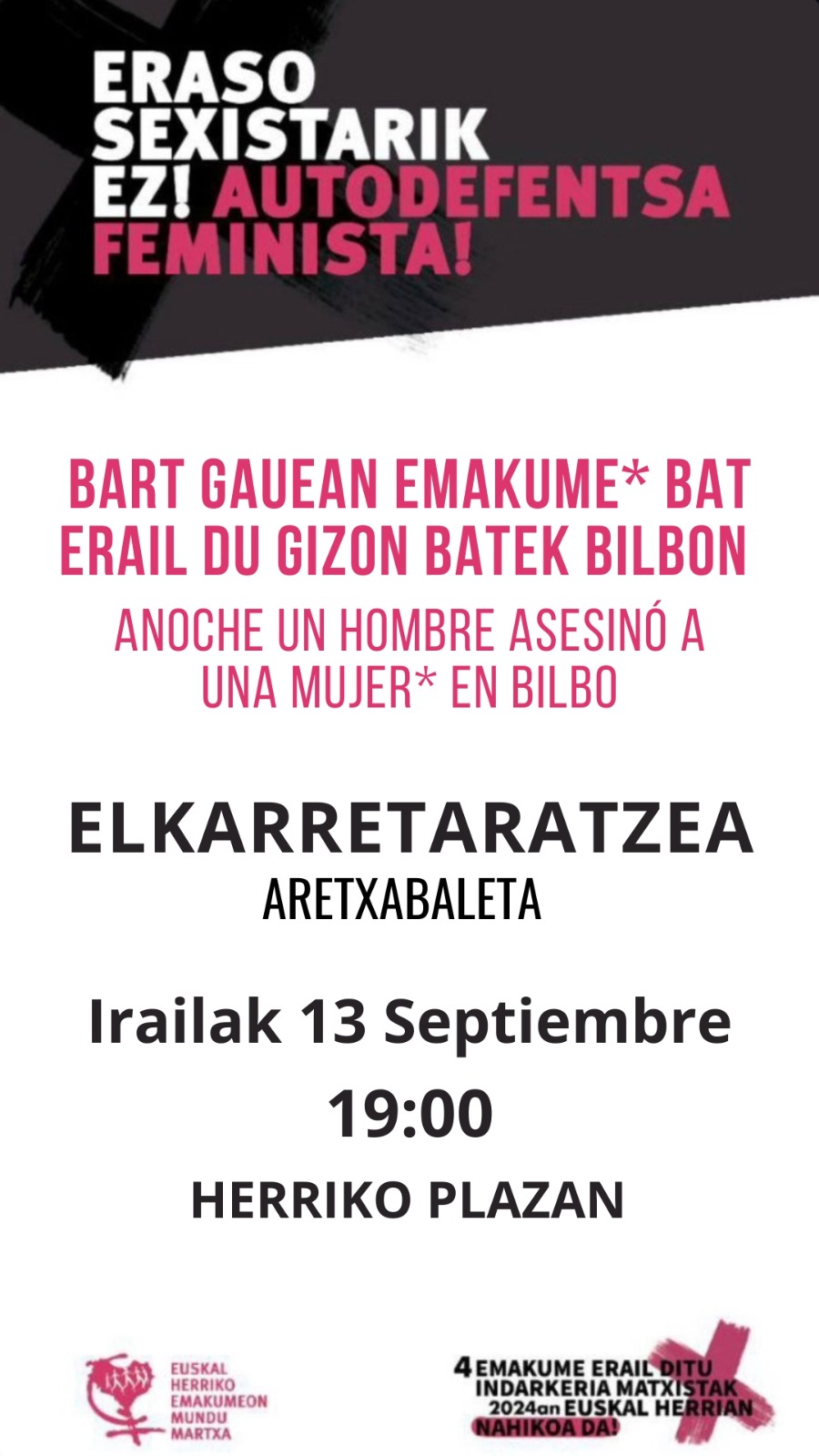 Aretxabaletako Udalak Bilbon egon den erailketa matxista gaitzesten du eta haren senide eta hurbilekoei babesa eta hurbiltasuna adierazi nahi die.