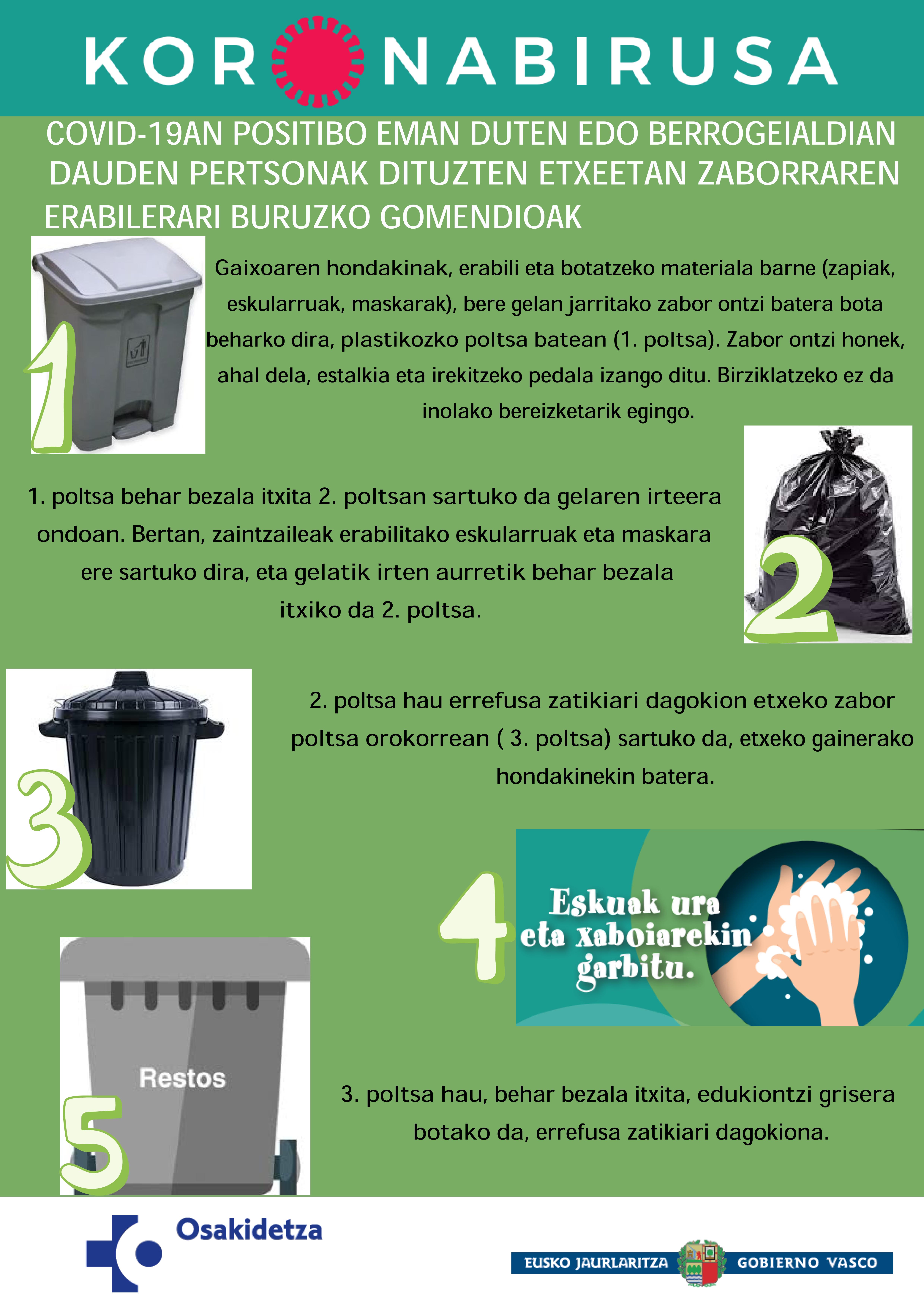 Gaixoaren hondakinak, erabili eta botatzeko materiala barne (zapiak, eskularruak, maskarak), bere gelan jarritako zabor ontzi batera bota beharko dira, plastikozko poltsa batean (1. poltsa). Zabor ontzi honek, ahal dela, estalkia eta irekitzeko pedala izango ditu. Birziklatzeko ez da inolako bereizketarik egingo.
