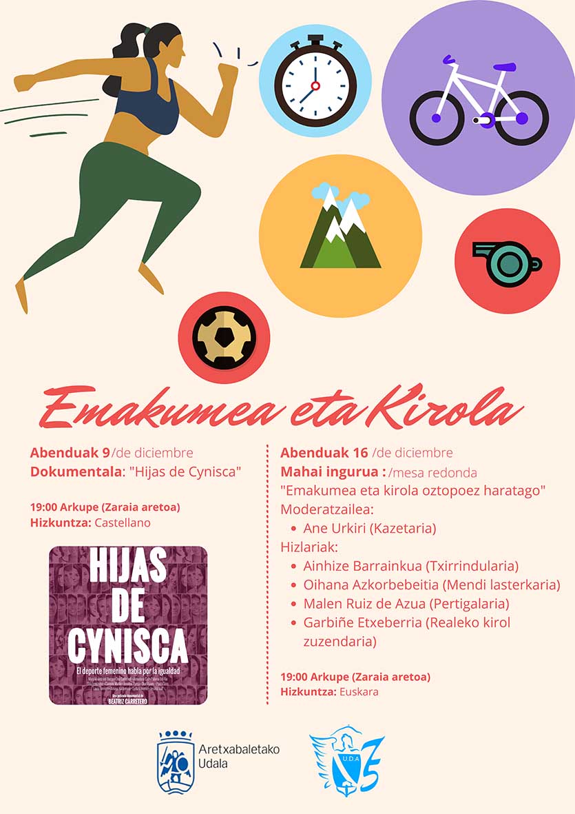 Berdintasun eta Kirol sailek, UDArekin batera, abenduaren 9 eta 16rako dokumental bat eta mahai-ingurua eskainiko dituzte. Hala, hilaren 9an, Arkupeko Zaraia aretoan Hijas De Cynisca filma proiektatuko da. Beatriz Carreterok zuzendutako film-dokumentala da, eta kirolean ematen den genero desberdintasunaren inguruan hitz egiten du. Bertan, erreferenteak diren eta euren ibilbidean lorpen handiak lortu dituzten emakumeei ahotsa ematen zaie. Hitzordua 19:00etan izango da.