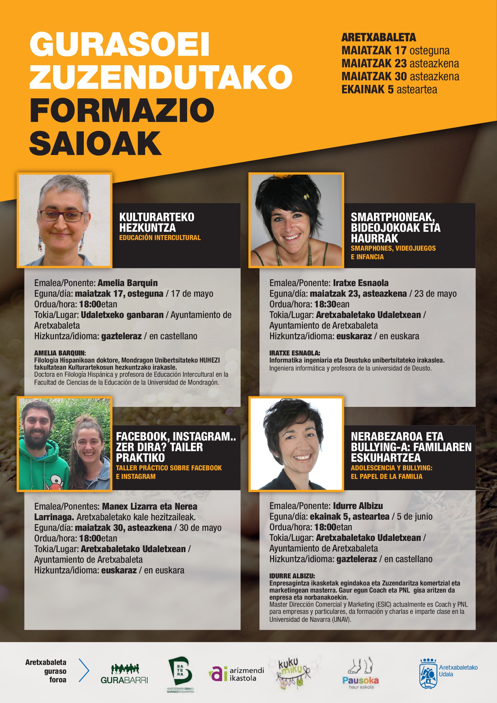 Aretxabaletako Udalak Guraso Foroarekin elkarlanean ondoko hitzaldi sorta antolatu du lehen hezkuntza eta bigarren hezkuntzako gurasoei zuzenduta.