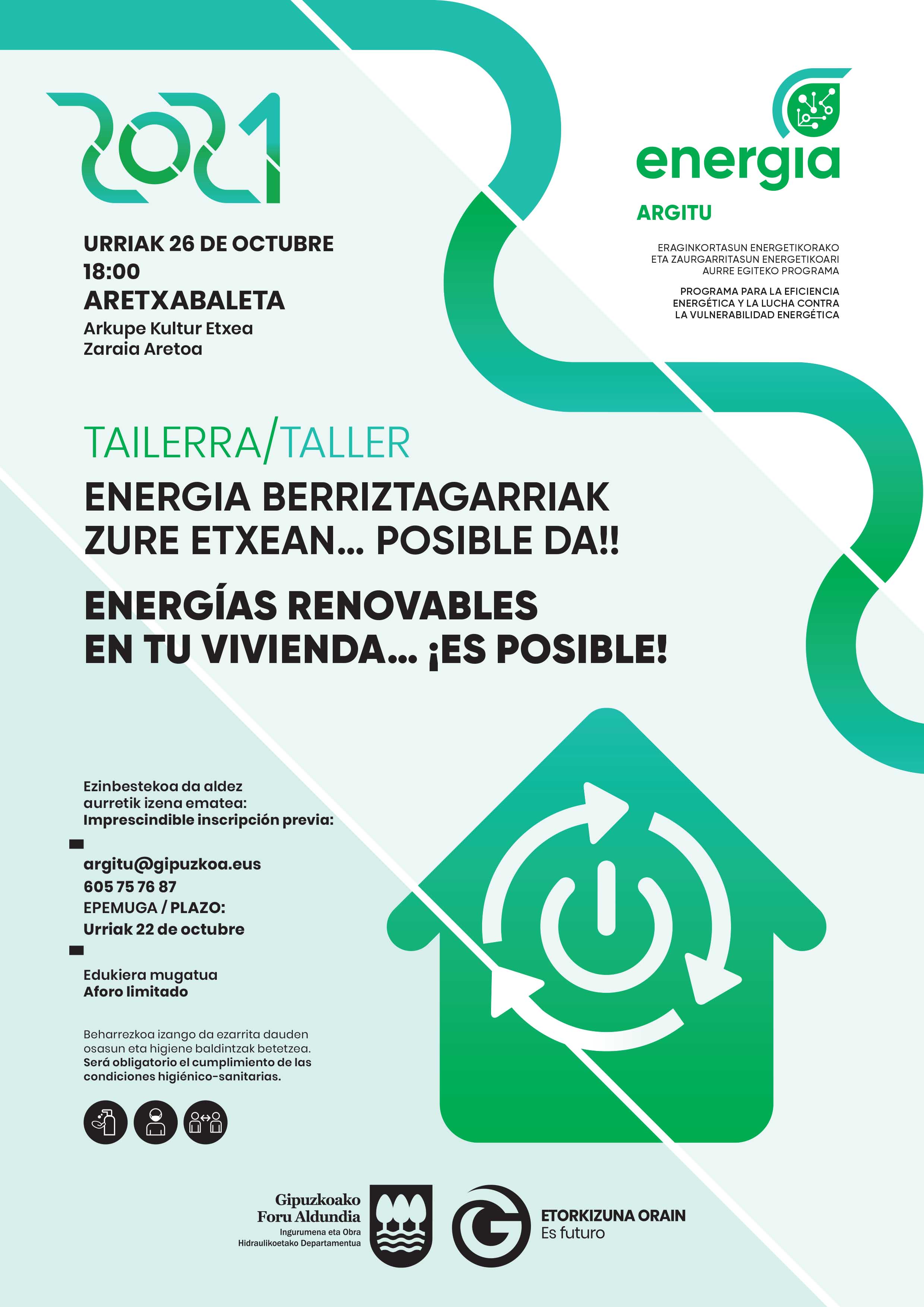 Gipuzkoako Foru Aldundiko Ingurumen eta Obra Hidraulikoetako Departamentuak, Aretxabaletako Udalarekin elkarlanean, Energia Argitu programaren baitan, etxebizitzetan energia berriztagarriak ezartzeko aukeren inguruan informatzeko tailerra antolatu du urriaren 26an, 18:00etan, Arkupe Kultur Etxeko Zaraia Aretoan.