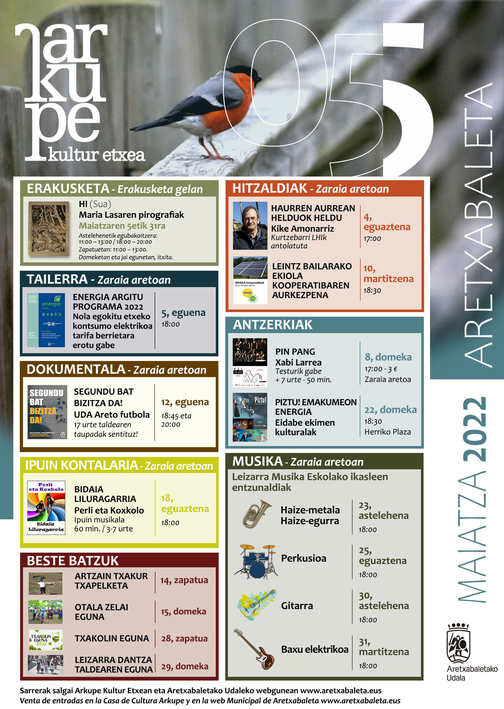 Maiatzaren 12an, UDA areto futbolaren 17. urteurrenaren baitan, Segundu bat bizitza da! dokumentala estreinatuko da. 18an, aldiz, Perli eta Koxkolo bikoteak Bidaia liluragarria ipuin musikatua aurkeztuko du. Aniztasunaren, berdintasunaren eta ekologiaren aldeko lan dibertigarria da, haurren irudimena pizteko eta familia giroan ezin hobe pasatzeko. Ikuskizuna hiru eta zazpi urte bitarteko haurrei zuzenduta dago, eta izena maiatzaren 9tik aurrera eman beharko da udal liburutegian.