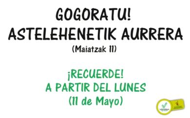 Datorren astelehenetik, maiatzaren 11tik aurrera, COVID19ak eragindako alarma egoera dela eta etendako zerbitzu hauek berriz ere martxan jarriko dira, ohiko ordutegian: