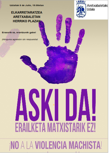 Aretxabaletako Udalak uztailaren 7an Murchanten egon den emakume baten erailketa matxista gaitzesten du, eta haren senide eta hurbilenekoei babesa eta hurbiltasuna adierazi nahi die.