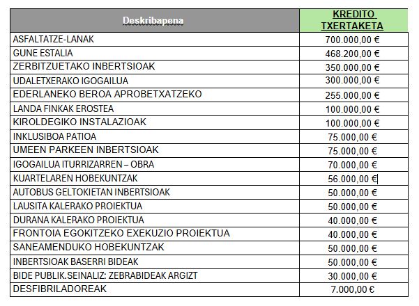 Onartutako 51 partiden artean, inbertsio garrantzitsuak nabarmentzen dira, hala nola, 700.000 € kaleak asfaltatzeko, mugikortasuna hobetuko duena; 468.000 € Gipuzkoa plazan eremu estali bat sortzeko, 350.000 € udal zerbitzuetan hobekuntzak egiteko eta 300.000 € udaletxeko igogailu bat instalatzeko, irisgarritasuna hobetuz.