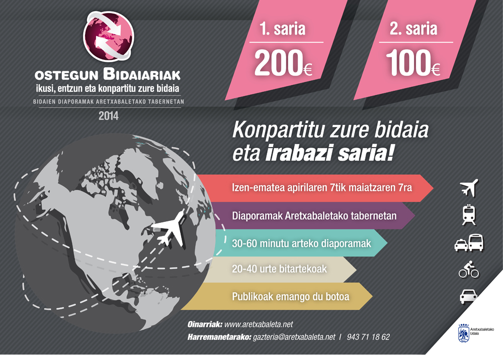 Irabazleak publikoak aukeratuko ditu. Aretxabaletako tabernetan dauden buzoietan egin ahal izango dute bozka ikusleek diaporamen ostean. Lanetan egingarri diren bidaietarako ideia iturri izateari eman nahi zaio garrantzia.