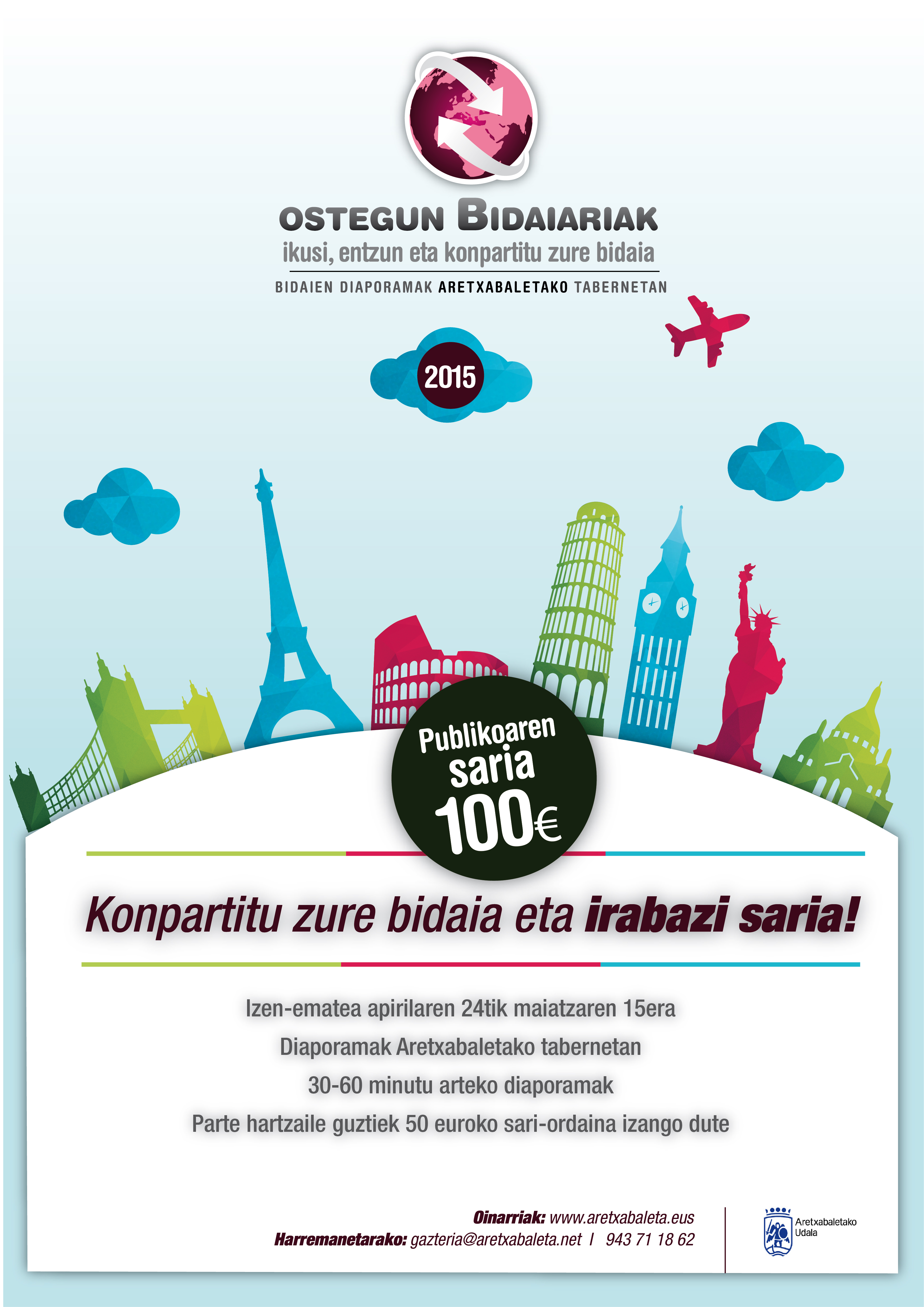 9. Izena ematea: Apirilaren 24tik maiatzaren 15era bitartean aurkeztu beharko dira bidaiaren laburpena eta argazkiak, gazteria@aretxabaleta.eus helbidera idatziz edo 943711862 telefonora deituz.