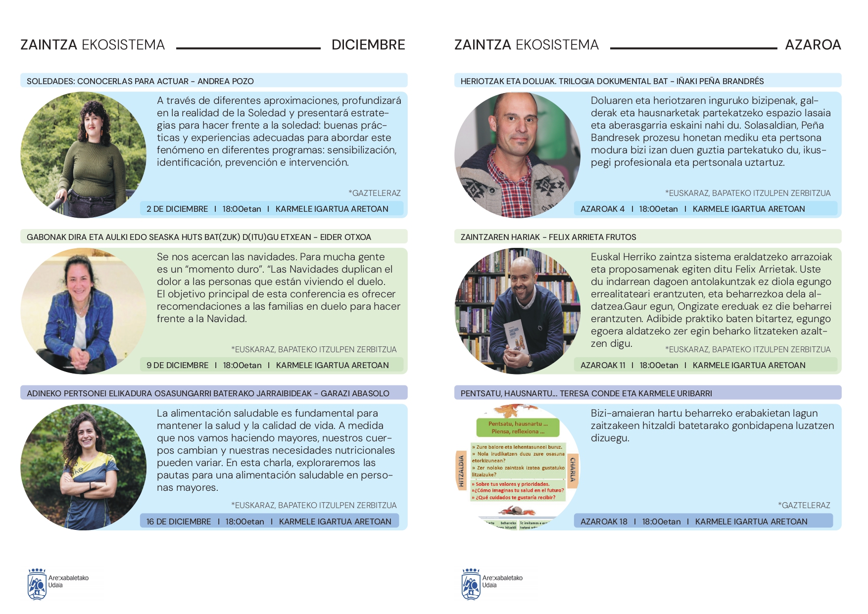 - Abenduak 2 – “Soledades: Conocerlas para actuar” Andre Pozo, ikertzailea. Bakardadearen fenomenoan sakonduko du, eta aurre egiteko estrategiak aurkeztuko ditu: sentsibilizazioa, identifikazioa, prebentzioa eta esku-hartzea.