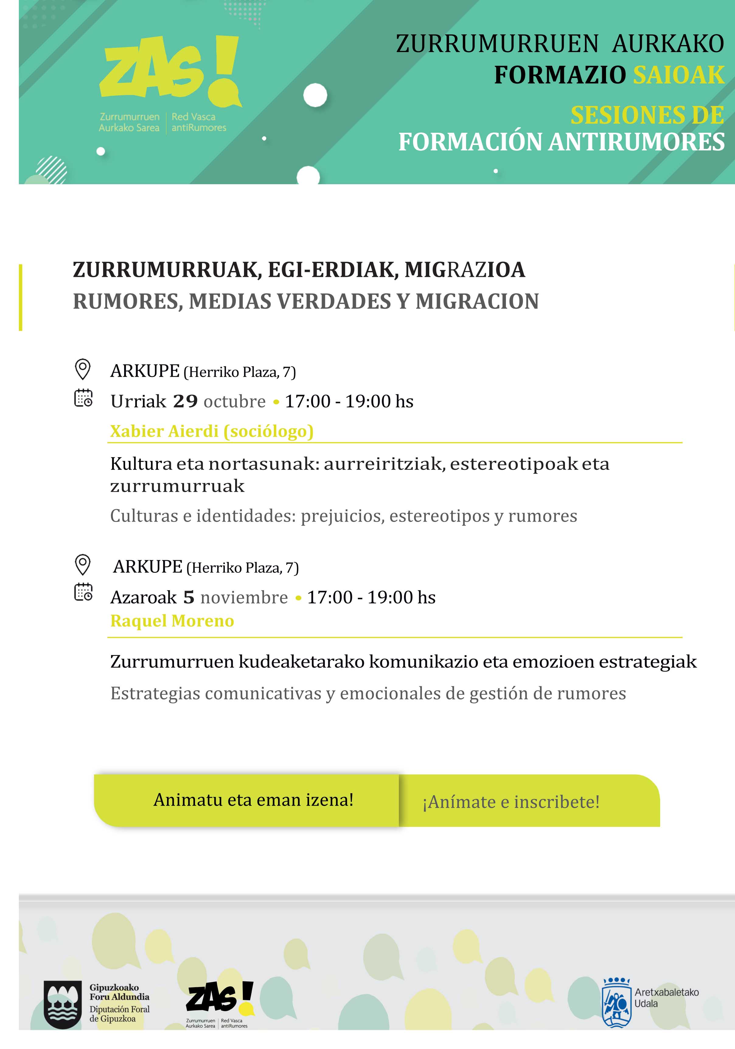 Aretxabaletan bi saio izango dira, “Zurrumurruak, egi-erdiak eta migrazioa” izenburupean. Saio horiek Udalaren babesa izango dute eta urriaren 29an eta azaroaren 5ean gauzatuko dira, arratsaldeko 17:00etatik 19:00etara.  Urriaren 29ko saioan Xabier Aierdi soziologoak parte hartuko du eta kulturez, identitateaz, aurreiritziez, estereotipoez eta zurrumurruez hitz egingo du. Azaroaren 5eko saioan, berriz, Raquel Romerok parte hartuko du, eta berak zurrumurruak kudeatzeko baliagarri diren komunikazio eta emozio estrategiak azalduko ditu.