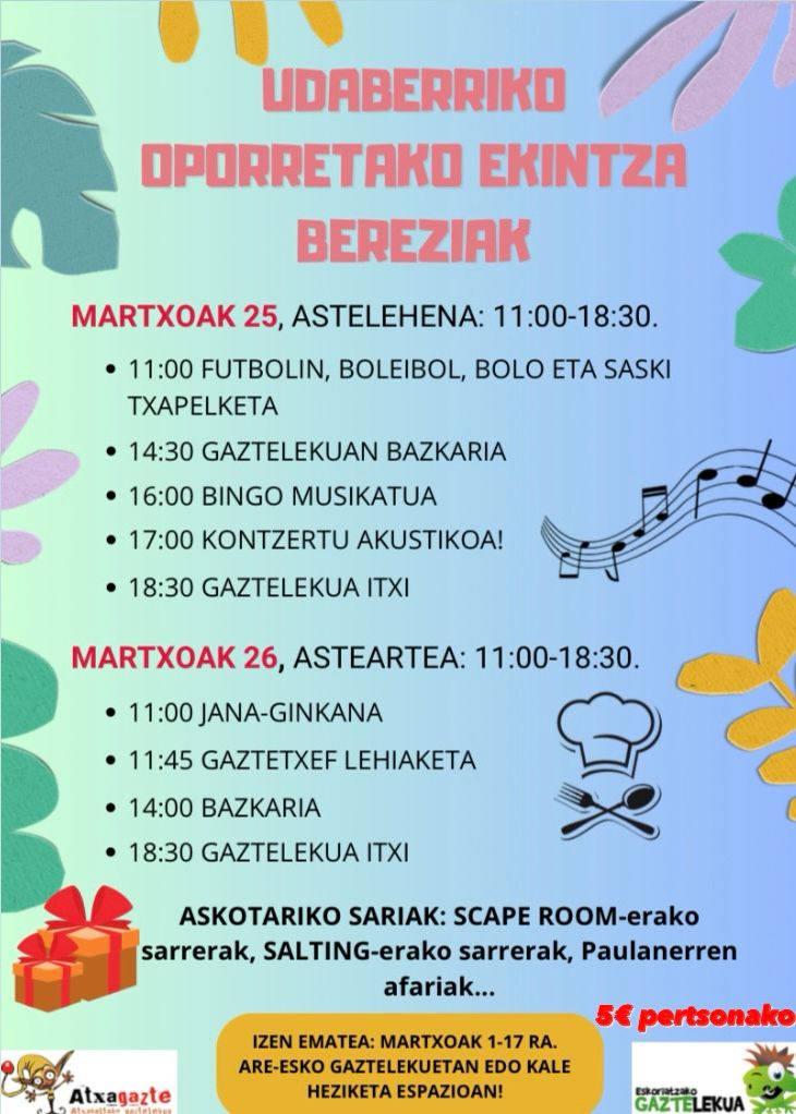 Urtero bezala aurten ere Aste Santuko oporretako lehen egunetan Aretxabaleta eta Eskoriatzako gaztelekuek elkarlanean hainbat ekintza antolatu dituzte.  Eskaintza 12-17 urte bitarteko nerabeei zuzenduta dago eta ekintzak egun batean Aretxabaletan eta bestean Eskoriatzan eramango dira aurrera.