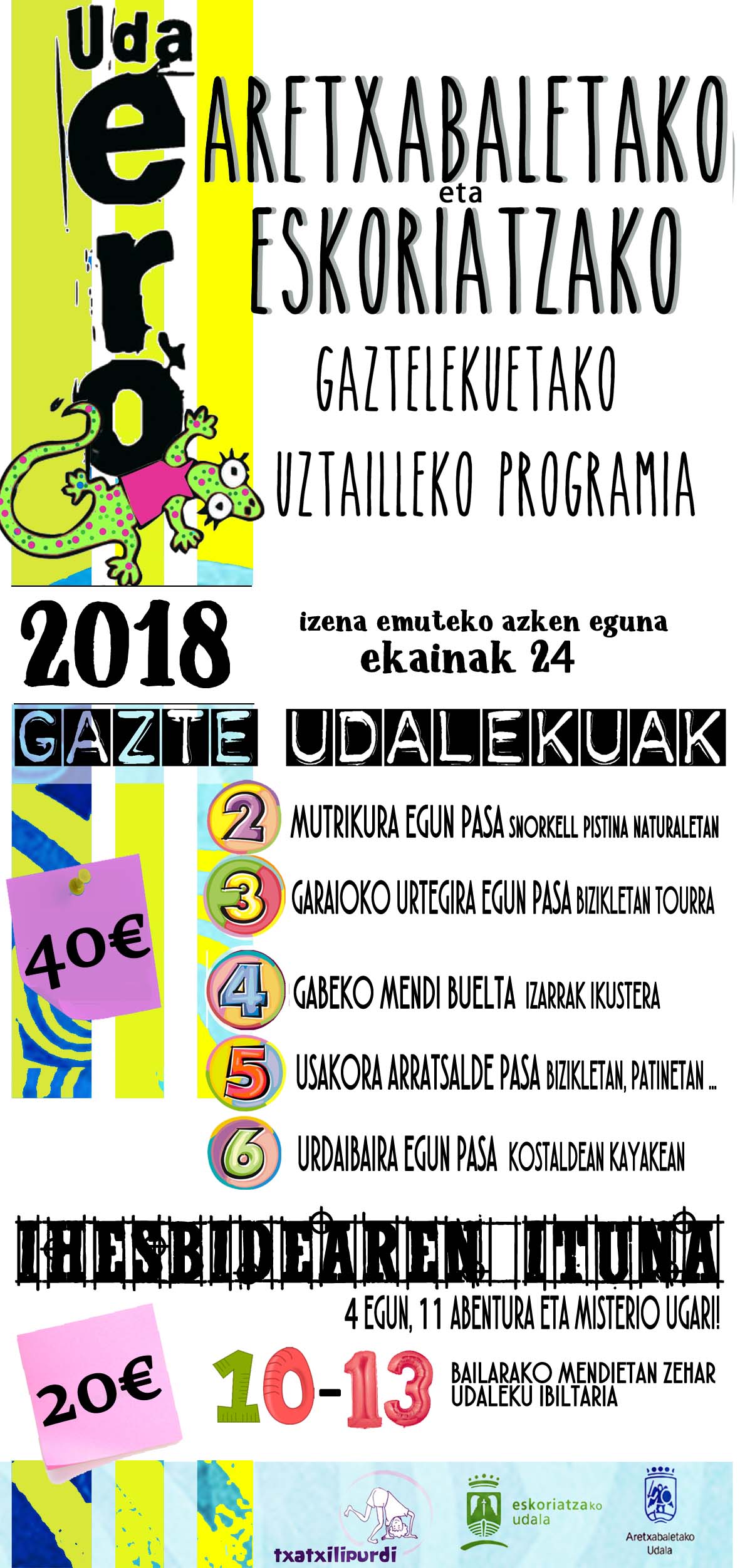 Aretxabaleta eta Eskoriatzako gaztelekuek elkarrekin antolatzen duten udako aisialdi eskaintza da Udaero. 12/13-17 urte bitarteko gaztetxoei zuzenduta dago. Egitasmoa 2 zatitan banatuta dago eta gazte udalekuetan bakarrik, gaztekonkisean bakarrik edo bietan eman daiteke izena. Azken hilabetean, Aretxabaletako eta Eskoriatzako gaztelekuetan ze ekintza egin pentsatzen jardun ondoren ondoko programa osatu dute: